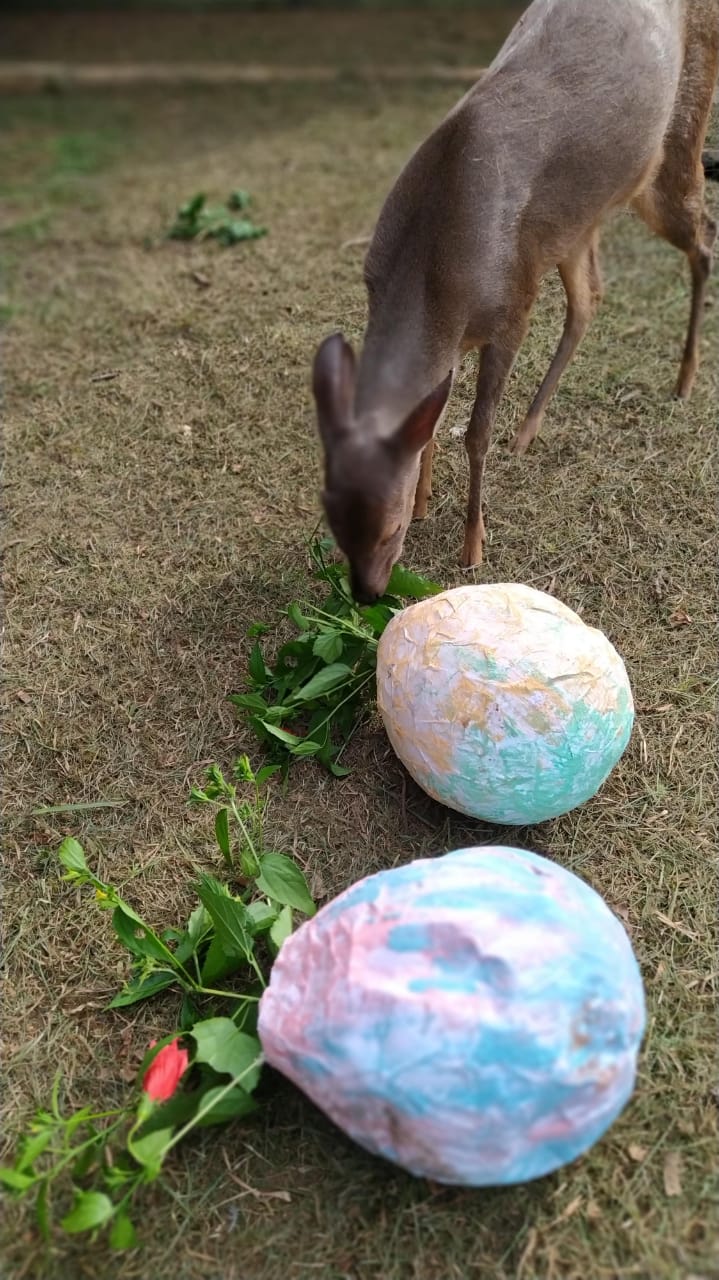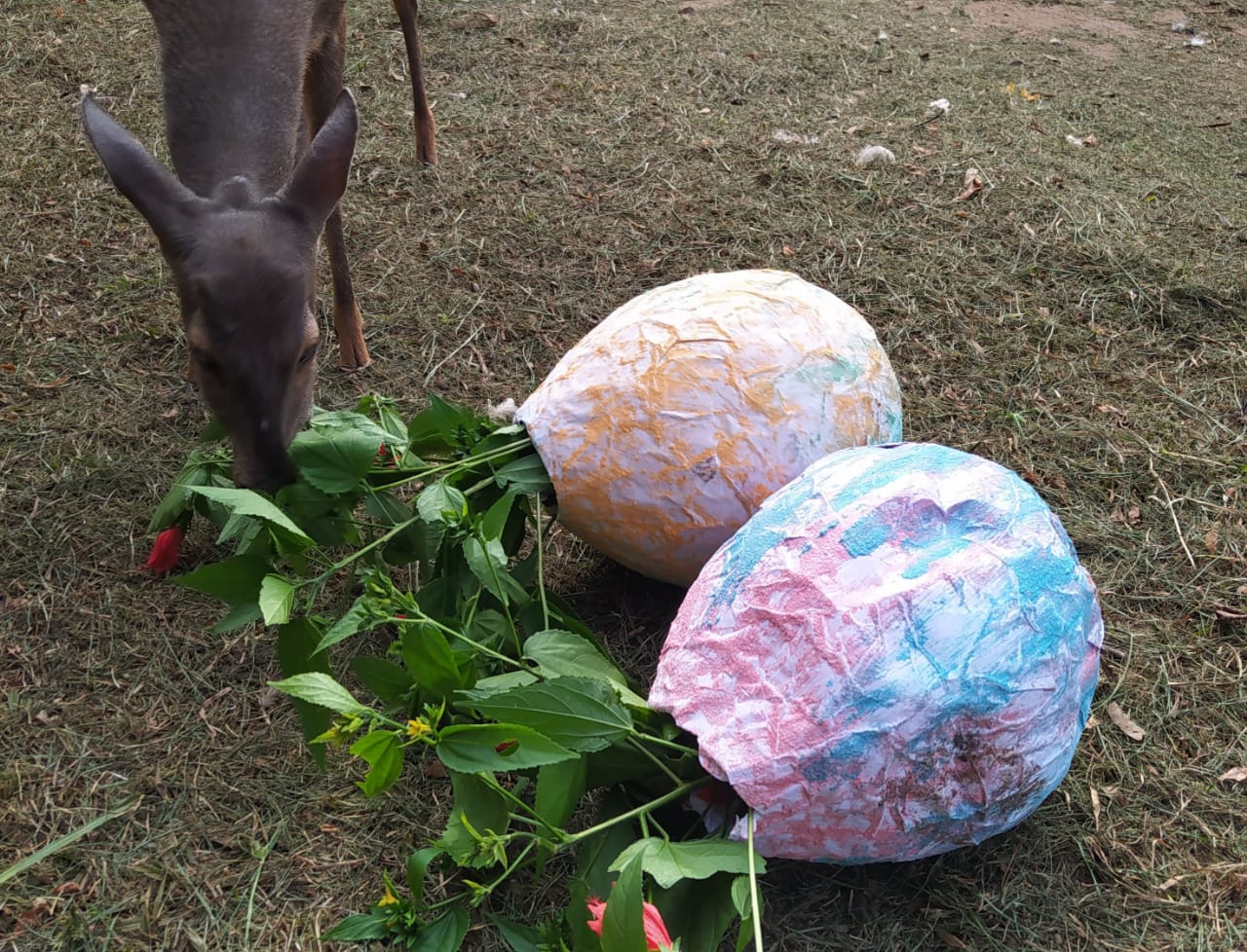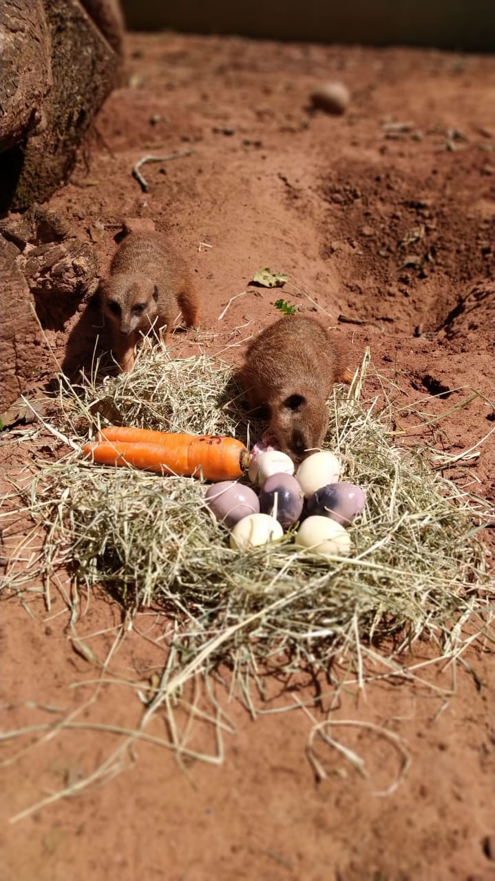 Um dos objetivos principais do zoológico é o bem estar dos animais, e uma ferramenta muito útil para promovê-lo é o “enriquecimento ambiental”. Essa ação consiste em oferecer novos estímulos sensoriais, alimentares, cognitivos, sociais e físicos aos bichos, como uma forma de divertimento, quebra da rotina e incentivo ao raciocínio. Aqui no Zoo de Bauru, costumam ser feitos enriquecimentos ambientais temáticos, e no último final de semana não foi diferente: os habitantes do zoo foram presenteados com “ovos de páscoa”.