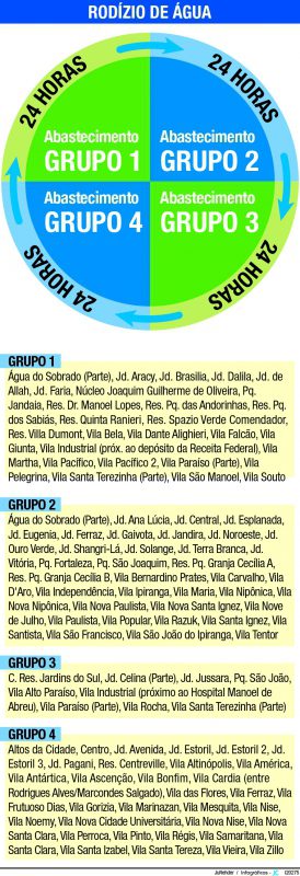 Nesta quinta-feira (3), segundo o DAE, serão atendidos pelo rodízio os bairros do Grupo 4 (regiões do Altos da Cidade, Centro e Jardim Estoril).