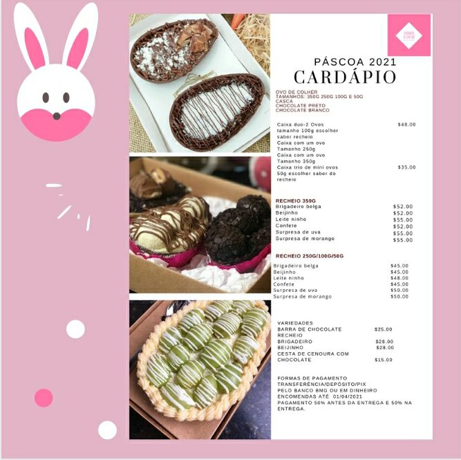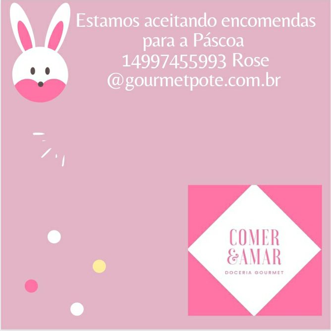 Delícias de Páscoa Carlos 5 anos atrás COMER & AMAR Doceria Gourmet ▪Ovos de Colher ▪Chocolates Recheados ▪Bolos ▪Cestas * sabores nos banners Contato: ¹⁴ 99745 5993