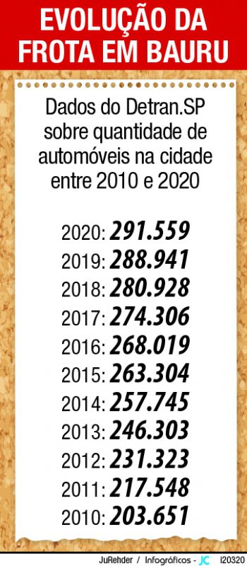 Nesta última década, o trânsito de Bauru foi impactado com cerca de 88 mil veículos a mais. Segundo o Departamento Estadual de Trânsito de São Paulo (Detran-SP), a frota do município passou de 203.651 no final de 2010 para 291.559 atualmente. E a estimativa é de crescer ainda mais em janeiro, mês de férias, quando a cidade costuma receber acréscimo de carros rodando pelo perímetro urbano, vindos da região a passeio, segundo a Emdurb.