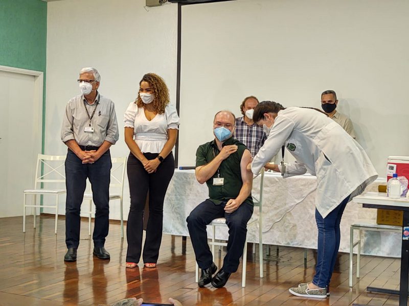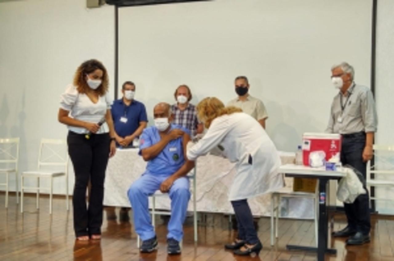 Com a chegada de 8.680 doses da vacina Coronavac em Bauru nesta quarta-feira (20), três profissionais da saúde foram imunizados no início da noite de hoje na sede da Associação Paulista de Medicina (APM). José Luiz Costa Magalhães, 66 anos, auxiliar de enfermagem da UPA Mary Dota foi o primeiro a receber a dose da vacina.