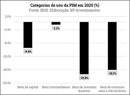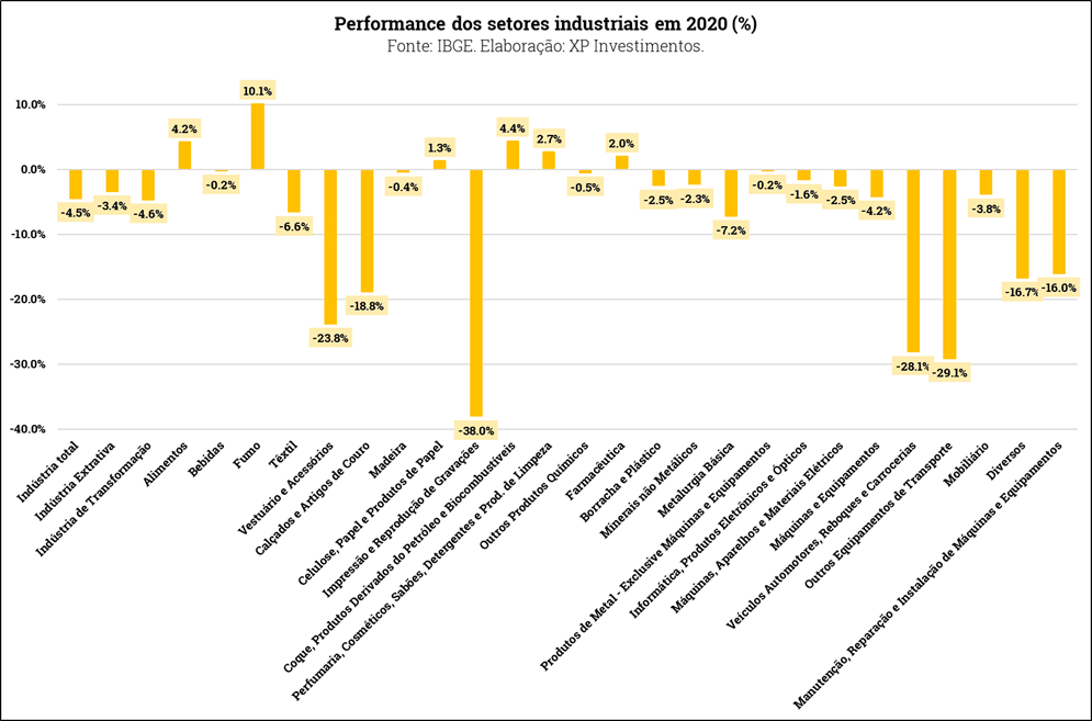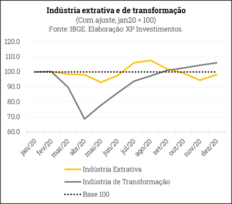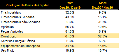 A produção industrial brasileira cresceu +8,3% a/a e +0,9% m/m em dezembro. Tanto a indústria extrativa quanto a indústria de transformação tiveram bons desempenhos no mês, expandindo 3,7% m/m e 1,5% m/m, respectivamente. Com o resultado de hoje, a produção industrial brasileira desacelerou apenas 4,5% em 2020.