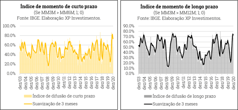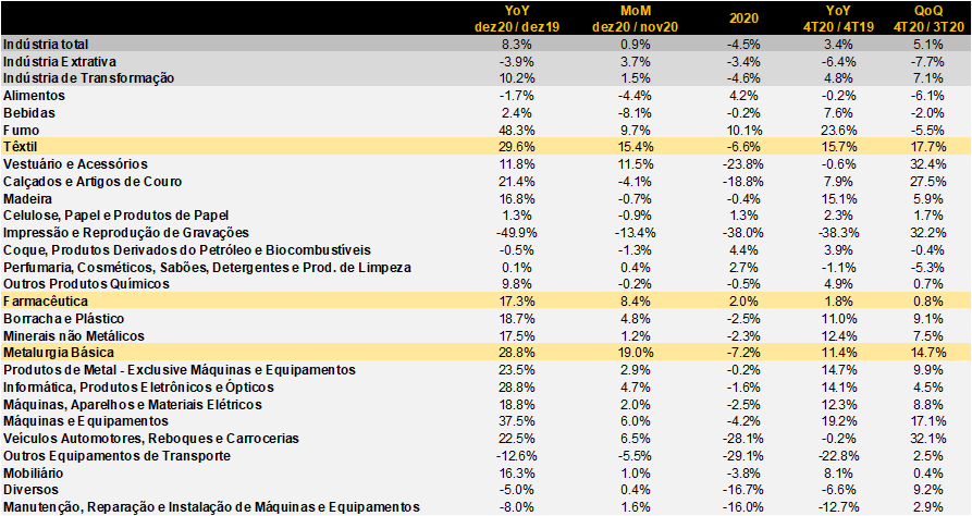Além da indústria extrativa, metalurgia, indústria farmacêutica e vestuário foram os principais destaques positivos em dezembro. Bens de capital e insumos típicos para a construção civil (proxies de investimento) também apresentaram bom desempenho no mês. A indústria de alimentos, por outro lado, perdeu fôlego no período.