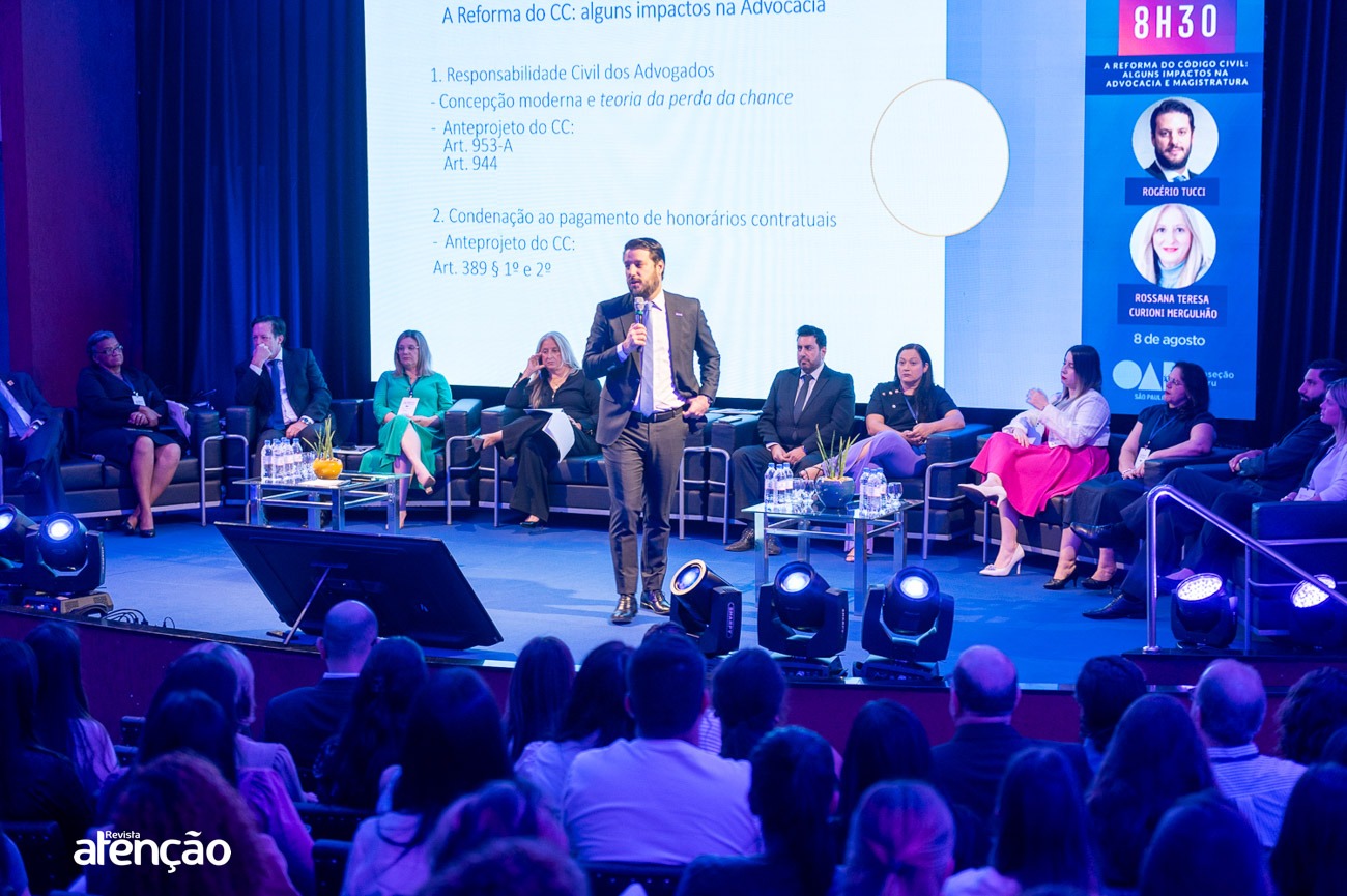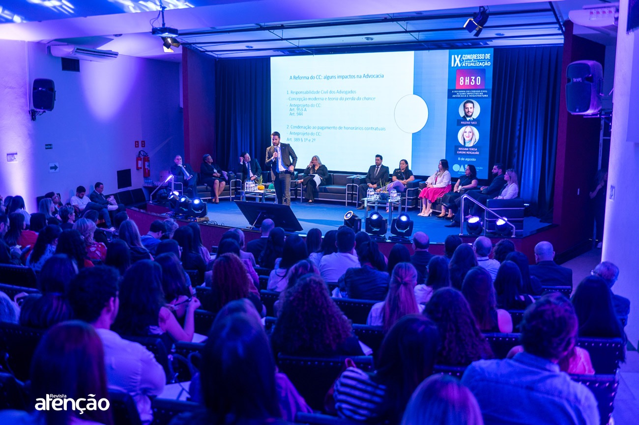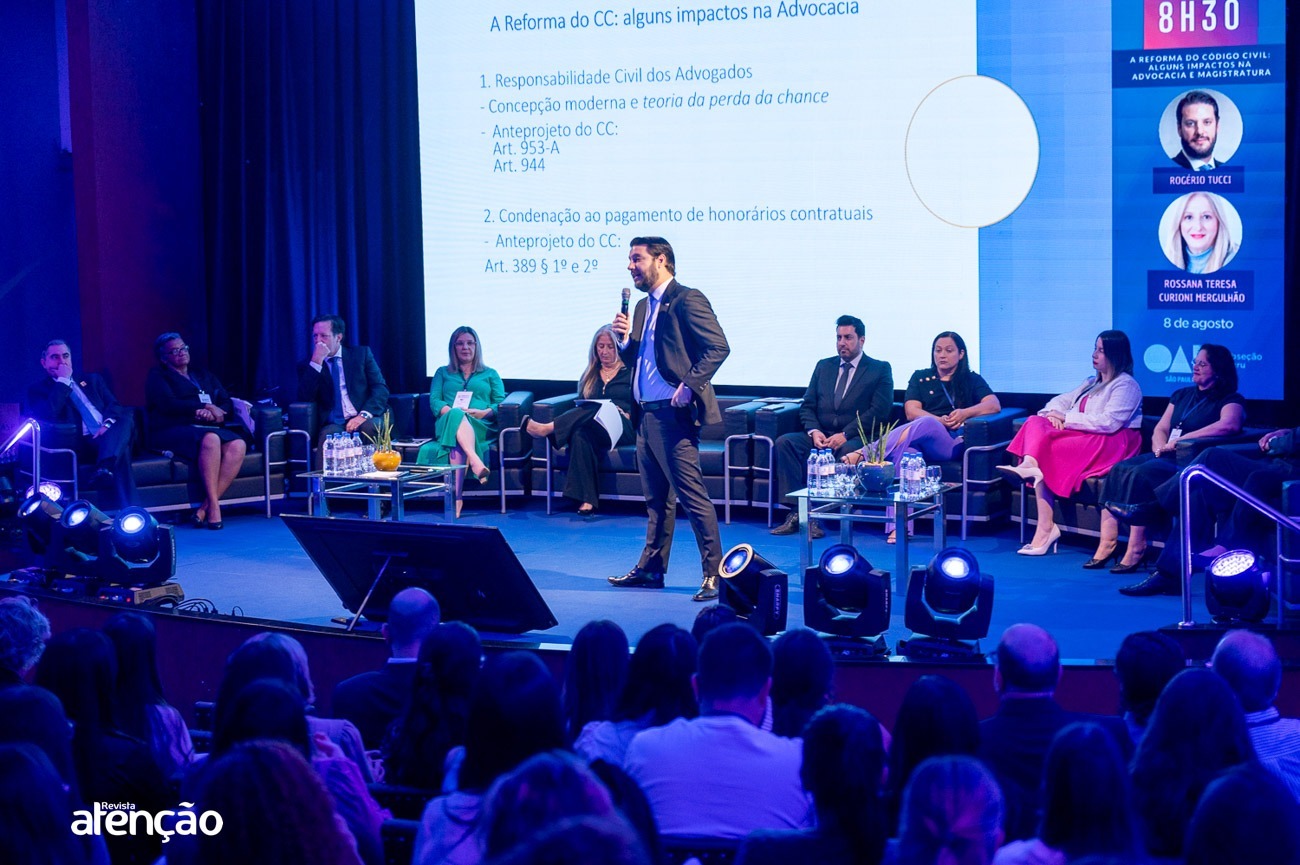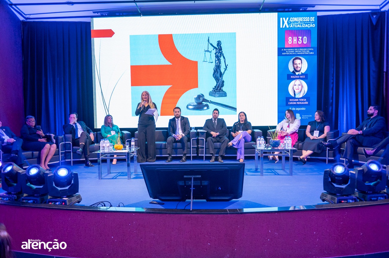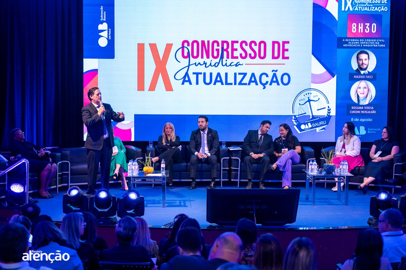 No dia 8 de agosto, a Associação dos Advogados de São Paulo (AASP) participou do IX Congresso de Atualização Jurídica, promovido pela OAB Bauru. O evento ocorreu entre os dias 7 e 9 de agosto e reuniu advogados, bacharéis e estudantes de Direito. A AASP foi representada pelo Diretor Rogério Tucci e pelo Superintendente, Róger Morcelli, que participaram de um painel junto com a Juíza de Direito Rossana Teresa Curioni Mergulhão, discutindo os principais impactos da Reforma do Código Civil na Advocacia e na Magistratura. Durante o Congresso, os participantes tiveram a oportunidade de conhecer os serviços e produtos oferecidos pela AASP, por meio da Unidade Móvel e do estande da Associação, reforçando a credibilidade e os benefícios do seu ecossistema.