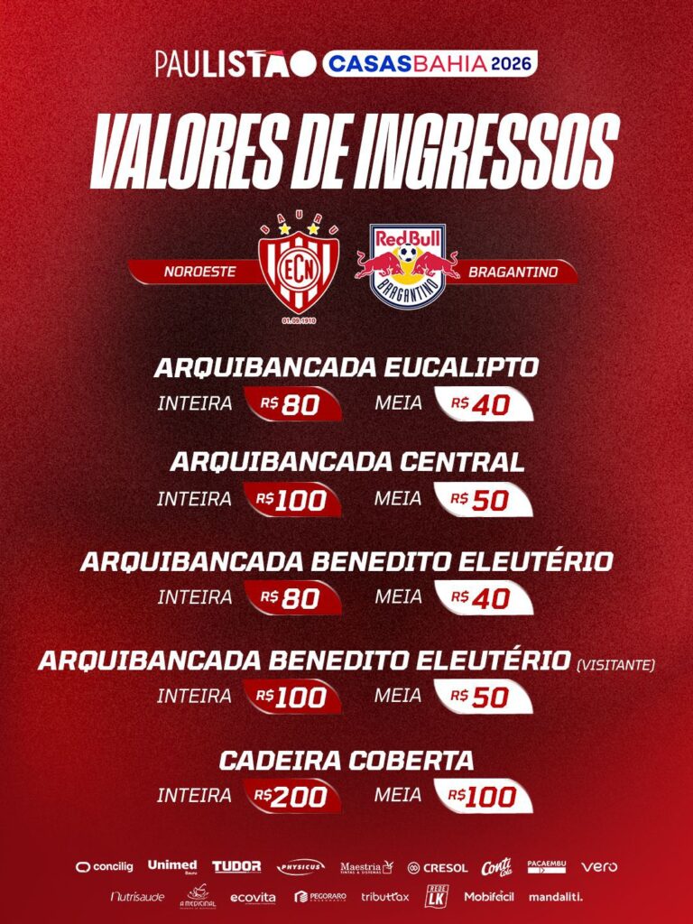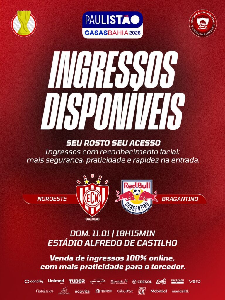 O Noroeste inicia a temporada 2026 com um grande desafio no Paulistão. No próximo dia 11 de janeiro, o Alvirrubro estreia na competição diante do Red Bull Bragantino, no Estádio Alfredo de Castilho, em Bauru. Para a partida, o clube já definiu os valores dos ingressos avulsos, que estarão disponíveis conforme cada setor do estádio.