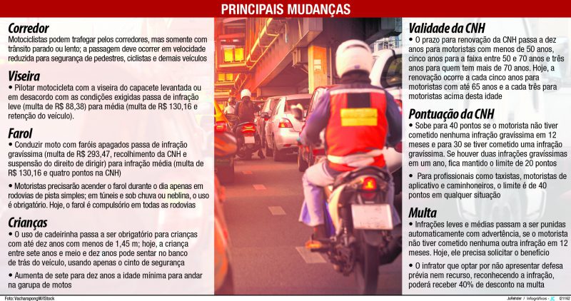 A reforma do CTB também trouxe outras alterações para motociclistas, como o abrandamento da punição para quem trafegar com faróis apagados dentro da cidade ou em rodovias. A infração passa de gravíssima a média, evitando o recolhimento da CNH e a suspensão do direito de dirigir.