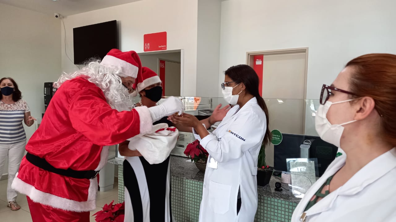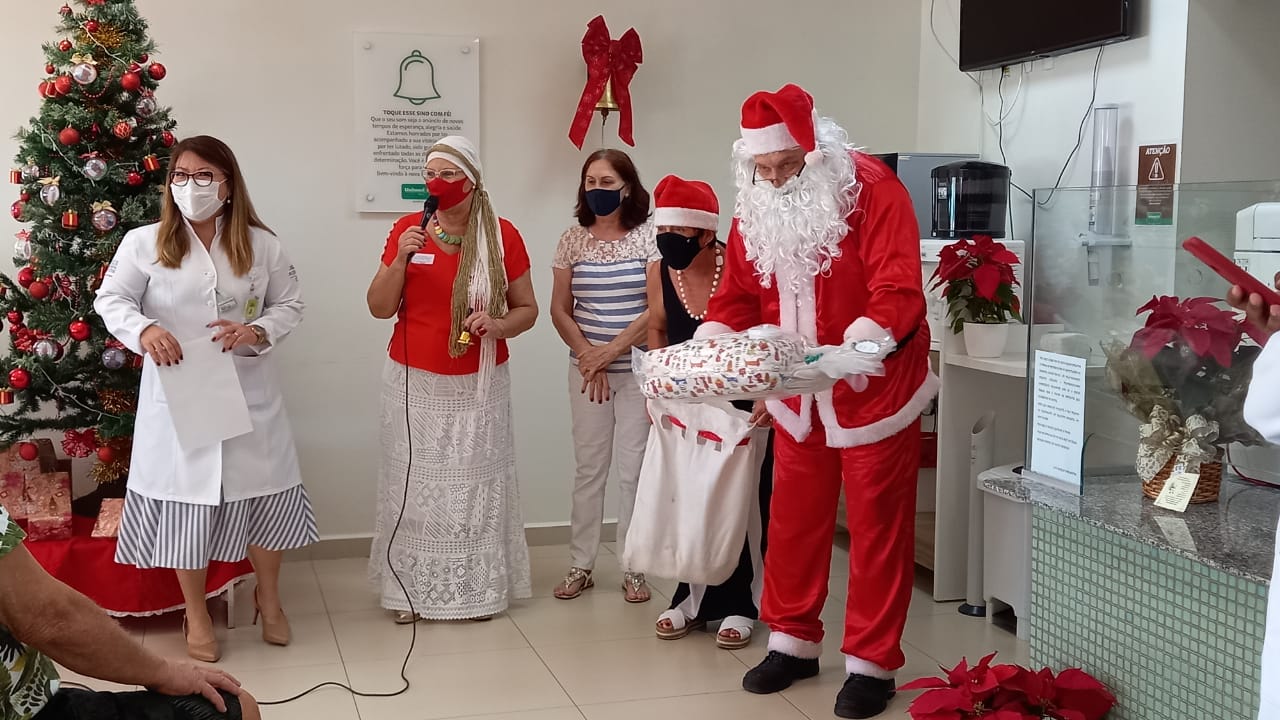 Em seguida, o que acrescentou mais emoção a todos foi a chegada do Papai Noel, representado por um amigo da paciente, que trouxe a emoção do Natal e presentes para todos.