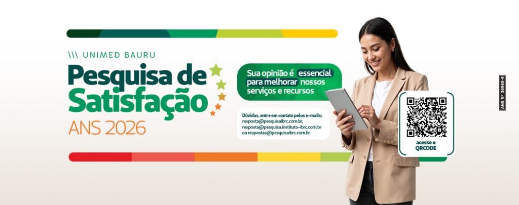 Durante os meses de janeiro a março de 2026, a Unimed Bauru realizará uma pesquisa de satisfação junto a seus beneficiários. Em parceria com o Instituto Ibero-Brasileiro de Relacionamento com o Cliente (IBRC), a aplicação do levantamento será feita por e-mail ou pelo link do IBRC: https://www.ibrc-pesquisas.com.br/pesquisas/web/loginCpf/282.